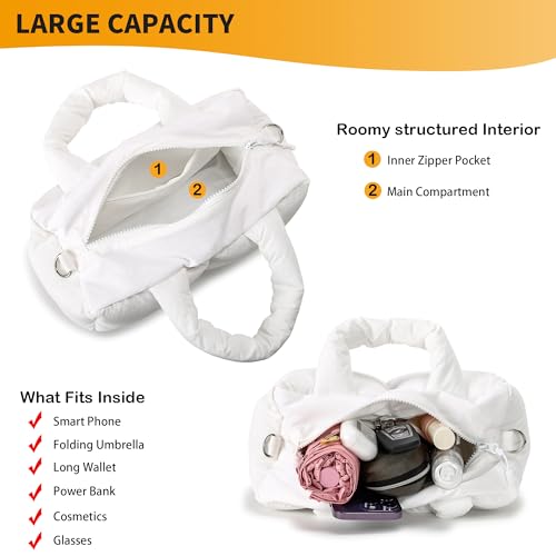 • [Roomy Capacity for Daily Use]: The puffy totes is big enough to carry your mini ipad, books and more. The spacious interior includes 1 zipper pocket, which can better classify and organize your items, allowing you to easily find what you need. Size:11.8“(L) x 5.1"(W) x 5.1"(H), Top Handle Drop: 5.5", shoulder strap drop:12.6"-25.2".