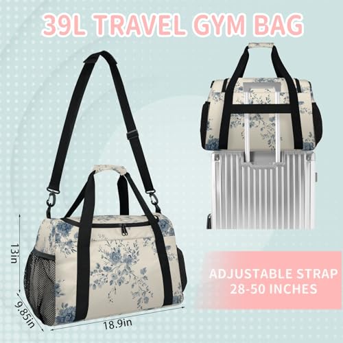 Flowers Blue Watercolor Retro Travel Duffel Bag Weekender Overnight Bags for Women Men Foldable Waterproof Tote Bag with Trolley Sleeve