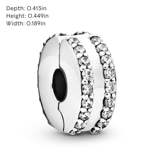 Item display length: 0.05 centimetersItem width: 0.19 inchesMaterial: MetalMetal type: Sterling SilverGem type: Cubic ZirconiaSterling Silver Bracelet Charm: Give your charm collection a contemporary update with this clip charm, hand-finished in sterling silver, featuring sparkling cubic zirconia and silicone grips for that extra-secure fit that lastsCompatible with Pandora Moments: Pandora Moments is a way to say something about who you are through every charm and bracelet you choose and how you choose to wear itFeatures CZ: Cubic zirconia could be said to be the jewel in Pandora's crown, making up the majority of stones we use in our jewelry because it optically looks like a diamondSterling Silver Jewelry: Silver is known for its gentle, white surface and is Pandora's signature metal, with the majority of our jewelry created from itOfficial PANDORA: This authentic piece of PANDORA jewelry is ready to gift to your loved ones on Mother's Day, Christmas, birthdays, anniversaries, or any special occasions with an official PANDORA gift box Perfect for everyday use. first-class materials and excellent craftsmanship ensure long-lasting durability.