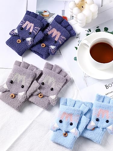 Geyoga 3 Pairs Kids Fingerless Gloves Convertible Flip Top Gloves Winter toasty Half Finger Mitten for Kids Boy Girl 5-10 Years(Purple, Sky Blue, Gray Mouse)