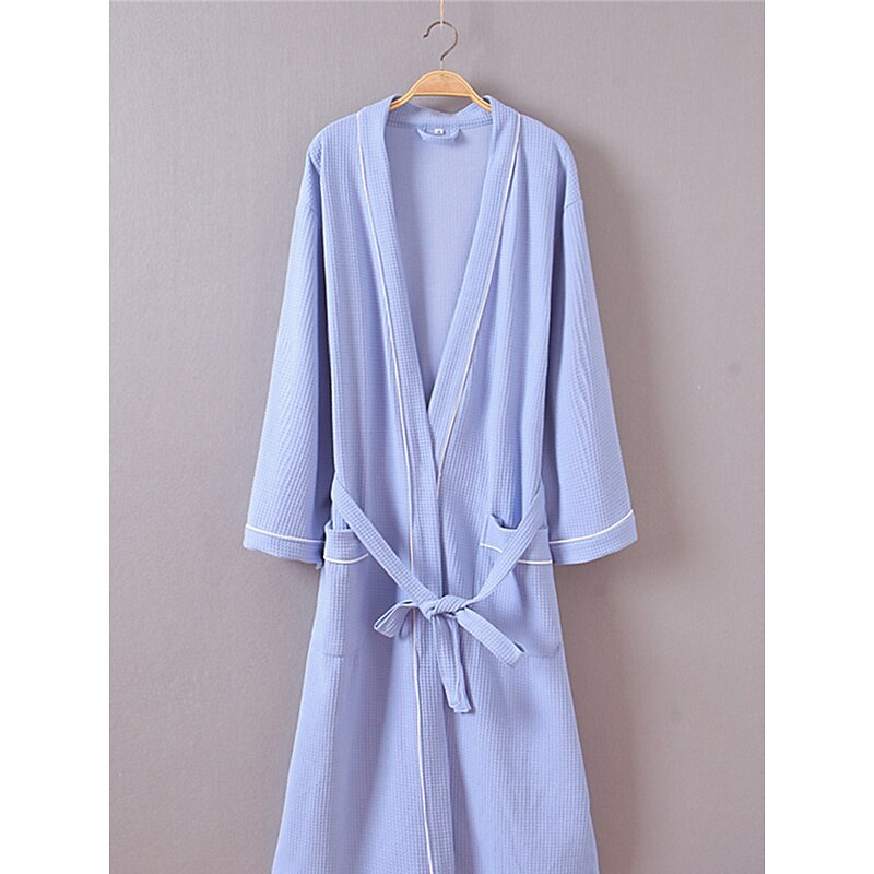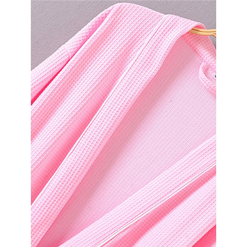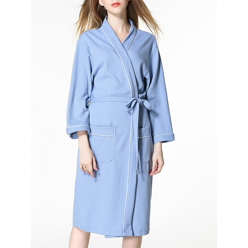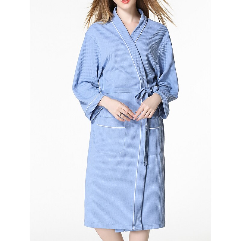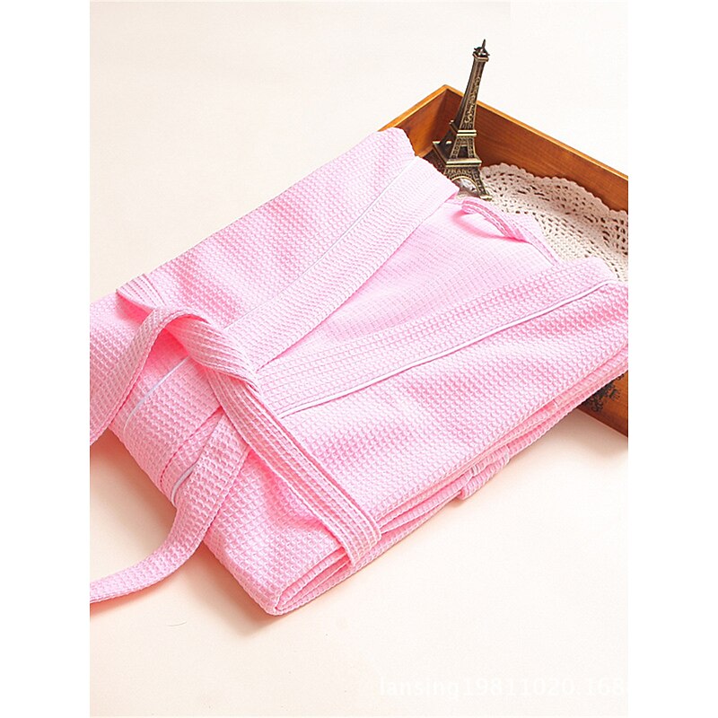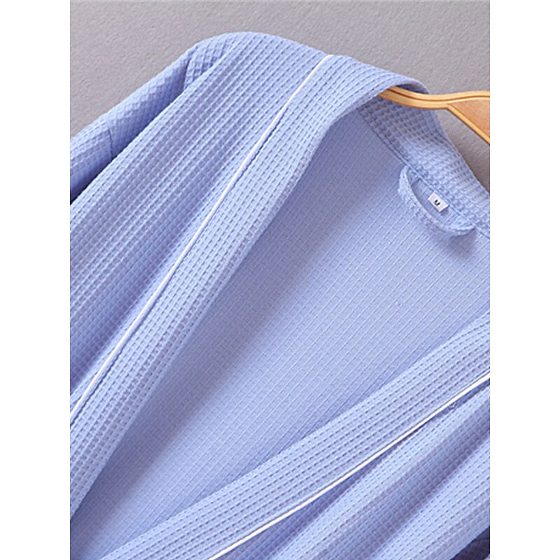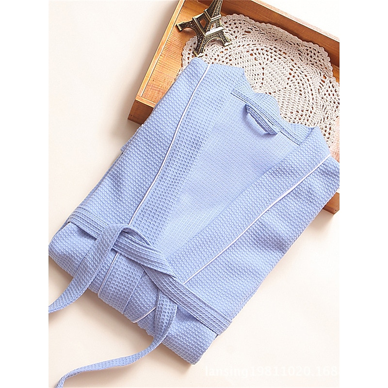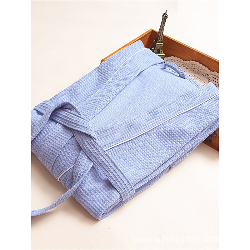 : This bathrobe showcases a sophisticated pure color design in blue, white, or pink, enhanced with sleek black piping for a chic appearance. The thoughtful inclusion of two front pockets adds practicality, while the matching tie belt at the waist allows for an adjustable fit that accentuates your silhouette.