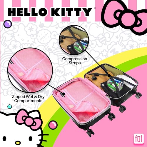 HELLO KITTY ROLLING LUGGAGE: Black hardshell luggage with a cute Hello Kitty design; Hardshell luggage carrier meets most airline requirements for carry-on luggage and fits into most overhead binsABUNDANT STORAGE: Hard luggage features a sizable polyester-lined main zip compartment for easy packing, a zip wet dry compartment for personal essentials, 2 mesh zip pockets for small accessories, clothing compression straps to keep clothing from wrinkling, and features expandable storage with 2-inch zipper gussetEASY PORTABILITY: Wheeled luggage features a lightweight upright design with eight 360-degree multi-directional spinner wheels and retractable handle which allows for effortless movementDURABLE: Travel luggage bag features a hard shell ABS plastic case which protects your luggage and is easy to spot cleanOFFICIAL HELLO KITTY PRODUCT: Hello Kitty carry on luggage with spinner wheels is an officially licensed Hello Kitty product; Suitcase carry on measures 14 W x 8 D x 21 H in inches, and weighs 10 lbs Perfect for everyday use. first-class materials and excellent craftsmanship ensure long-lasting durability.