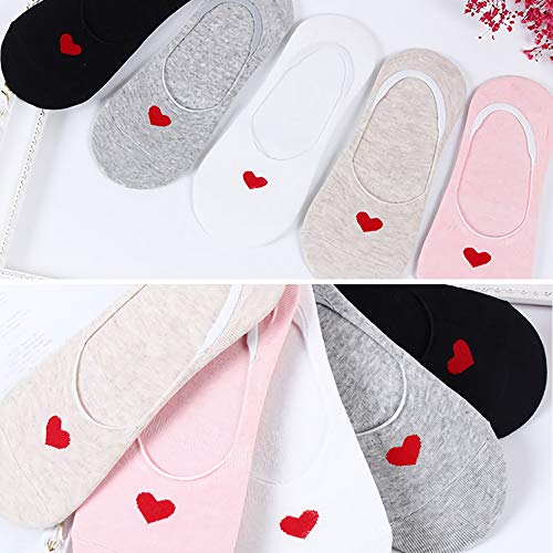 Women's No Show Socks – Cute Heart Pattern Low Cut Cotton supple, Non-Skid Non-Slip, 5 Pack seamless Invisible Liner Socks with Silicone Edge
