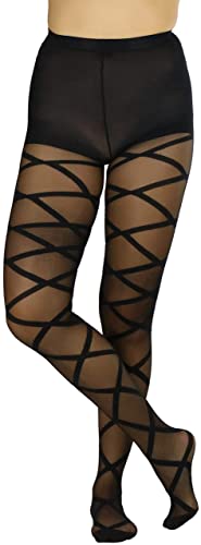 • 💕 Featuring: A Full length, semi-sheer construction with covered feet. Reinforced stitching through the toe. Vertical seam along the front. Opaque elasticated waistband for support. Criss crossing detailing along the legs in opaque black material.