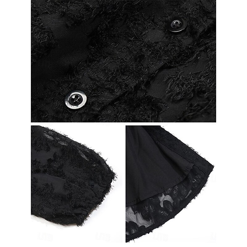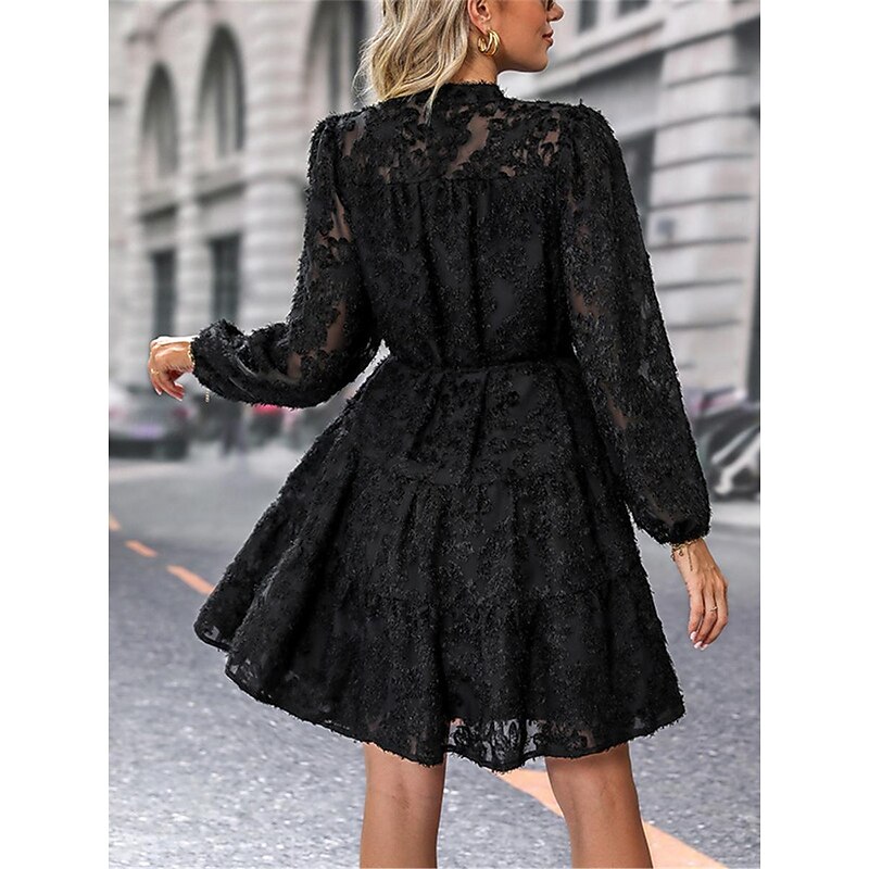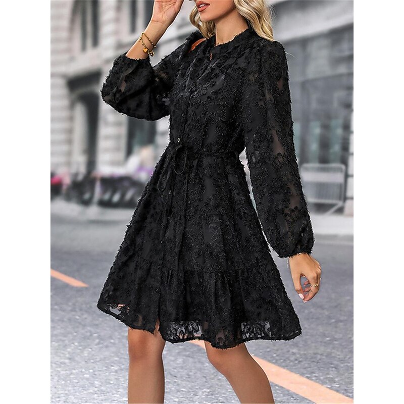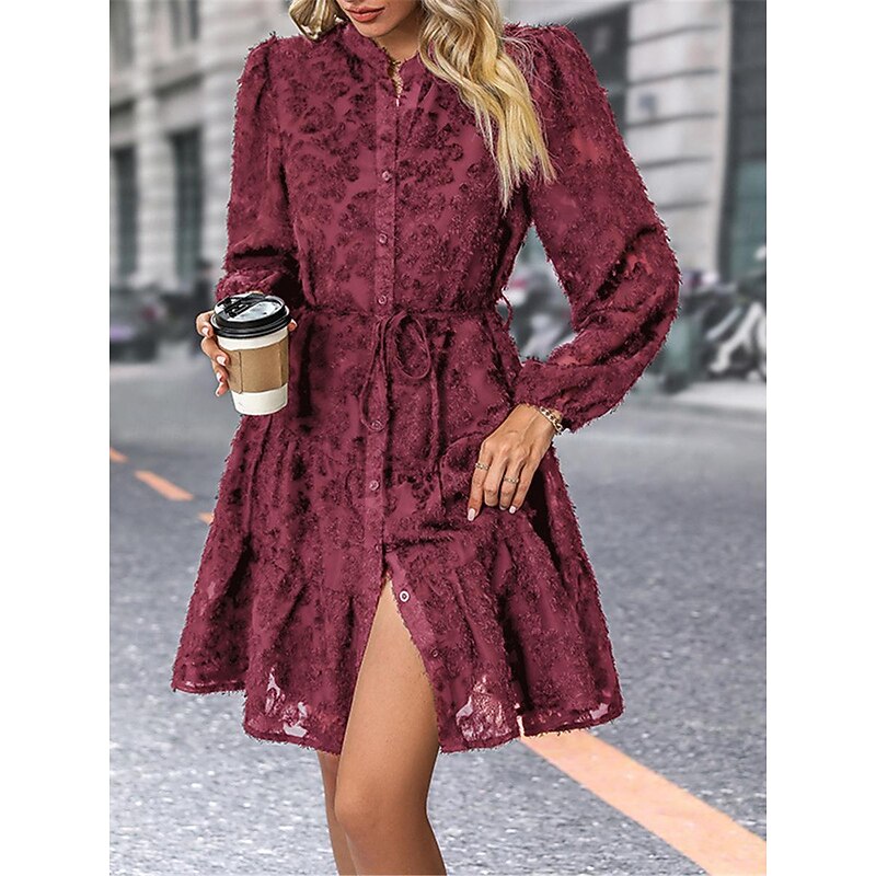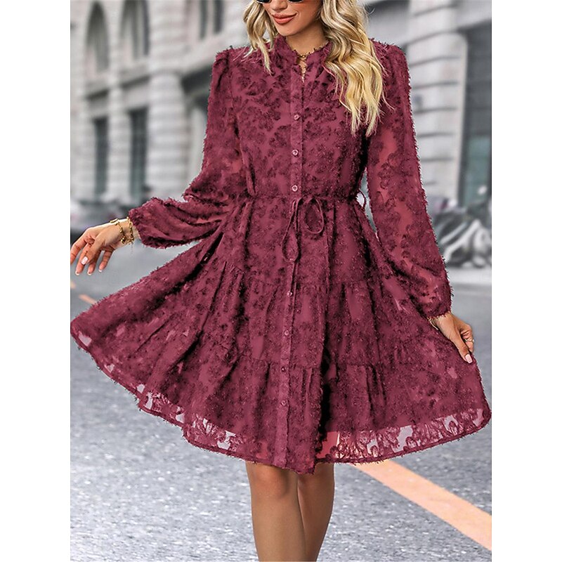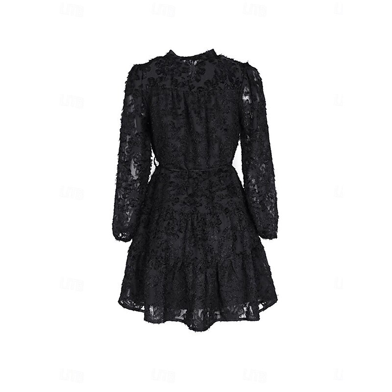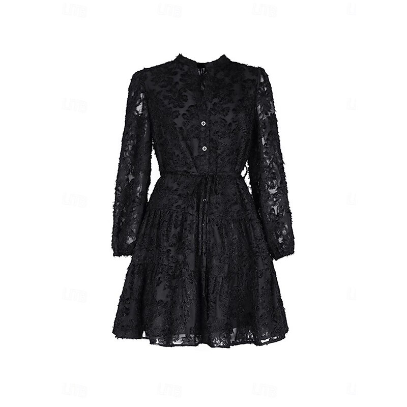 Highlights [Fabric] : Crafted from high-quality polyester, this elegant lace dress offers micro-elasticity for a comfortable fit. The delicate, sheer fabric adds a lightweight and airy feel, perfect for various occasions. [Silhouette] : This dress features a classic A-line silhouette, universally flattering and accentuating the waist for a graceful flow. [Design Highlights] : The dress comes with a stand collar and a button-up front for versatile styling. The long sleeves add a timeless charm, while the subtle drawstring belt allows for a personalized fit, enhancing the overall silhouette. The fabric’s slightly textured surface adds dimension to the ensemble. [Occasions] : Ideal for street style in the fall, this formal lace mini dress is suitable for both daytime outings and evening events. It offers a stylish statement while maintaining comfort and elegance. [Size Range] : Available in sizes S, M, L, and XL, in a selection of colors including Black, Navy Blue, Dark Green, and Wine, ensuring an option for every personal style.