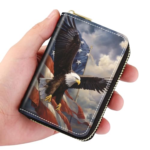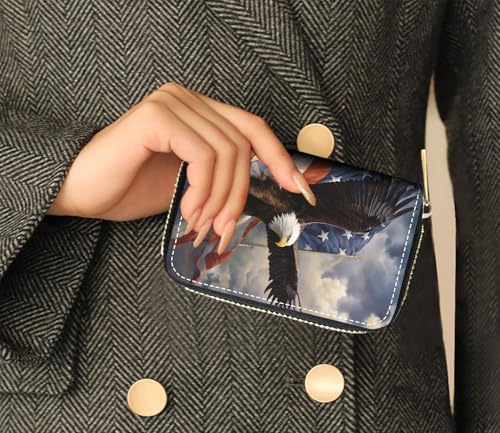Brand: POIUYTREWColor: POI-Card Case Wallets-044Material: LeatherStyle: ModernPattern: Patriotic American Flag Bald EagleProtable and Compact Size: This slim credit card holder for women measures 4.33 x 3.15 x 0.98 inch, fits perfectly in your pocket and purse. Accordion style card slots provide better organized push cards out easily.supreme Material: This credit card wallet are made of soft PU leather, smooth, anti fray, comfortable to the touch. Individual hand stitching to ensure women wallet’s longevity. The zipper designs make it stays closed and flat when stuffed.Plenty of Room: Slim card holder wallet designed with 9 accordion slots and 2 extra wide slots for receipts, cash and coins. Small size but large capacity, capacity for up to more than 18 cards.Privacy Security: Secure credit card wallet equipped with advanced RFID secure technology, perfectly block unwanted RFID scanners,don't give thieves any chance.Your Bank Debit,ID,ATM cards be protected all the time.Amazing Gift: Women's card wallet is the great choice for a variety of occasions such as Valentine's Day, Mother's Day, Christmas, birthdays, and Thanksgiving. Choose from a range of cute, funny, elegant and minimalist styles, it is a special gift option that everyone will love. Perfect for everyday use. High quality materials and excellent craftsmanship ensure long-lasting durability.