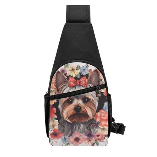 Sling Bag for Women Men Crossbody Shoulder Bag Yorkie Floral Chest Bag Small Sling Backpack Daypack Fanny Packs