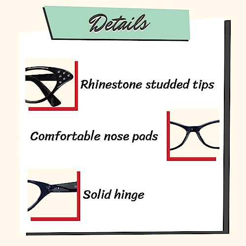 • RHINESTONE EMBELLISHMENTS - The corner part of the frames contain 6 shiny rhinestones to make the glasses really pop and add fanciness to the classic look. For a true 50s costume these cateye glasses with rhinestones are a must!