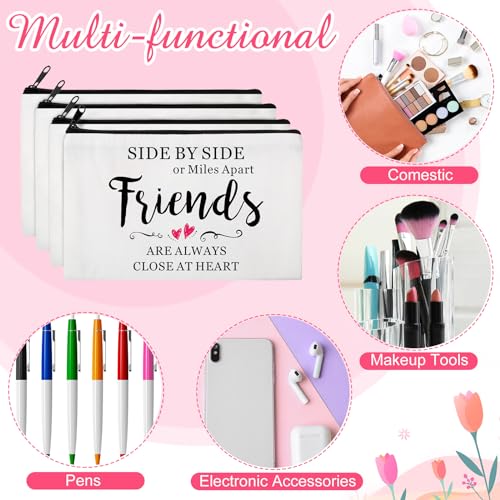 Material: CanvasClasp type: ToggleChain type: French WireItem type name: Makeup bagsIdeal Friendship Gifts: you will get 10 pcs friend makeup bags and 10 pcs adjustable friendship bracelets, enough quantity to meet your daily needs of storing many items, to meet your replacement needs; Which are nice combinations for you to prepare for your friends, women friends, long distance friend, bestie, nice and considerateSweet Words: the phrase [Side by side or miles apart, friends are always close at heart] is printed on each of cosmetic bags and bracelets for women, heated gifts for Christmas, birthday, thank you, housewarming, wedding, remembrance gift, miss you gift, stocking stuffer, graduation, Thanksgiving, Valentine's Day, etcCanvas Makeup Pouches: this durable canvas made cosmetic bag is robust, reliable and designed for longevity; Each bag size is approx. 23.5 x 15 cm/ 9.3 x 5.9 inches, and has enough space to store your cosmetics and cosmetic accessories, such as lipstick, eye shadow, makeup brush, makeup palette, etcAdjustable Bracelets: the friend bracelet is decorated with heart and star pendants, easy to get others' attention; It is designed with adjustable wrist circumferences, providing you with a better fitWide Range of Uses: these side friends gifts are light and convenient, without taking up too much space, they are suitable for you who often take business trips or travel; Besides, you can load your makeup accessories in these bags, so that you can fix your makeup during work or shopping, so that you can keep delicate makeup Perfect for everyday use. supreme materials and excellent craftsmanship ensure long-lasting durability.