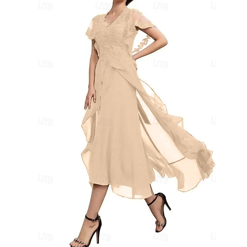 Why Choose A-Line Mother of the Bride Dress Elegant V Neck Tea Length Chiffon Short Sleeve with Solid Color?