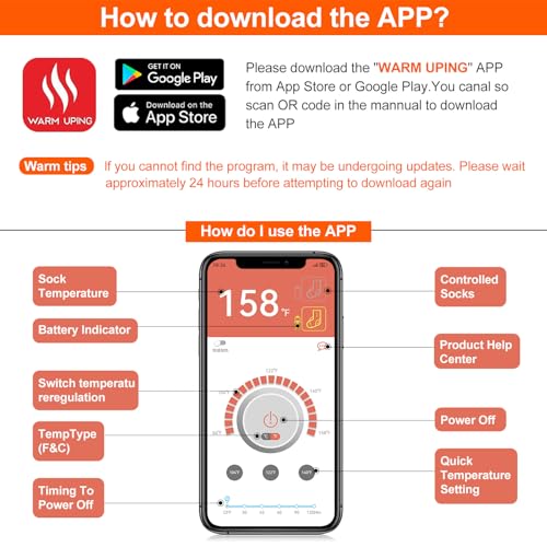 Size: Unisex-AdultBrand: CNaiyunpinColor: Pink-8000mAhMaterial: Cotton BlendBattery Capacity: 8000 Milliamp HoursSIZE FITS MOST: The heated socks have excellent elasticity and comfort for a perfect fit for all foot shapes.the electric socks are made of 3D hidden looped heating wires that cover the toe area, so that your feet are no longer cold and stiff! Perfect for men, women and even as a thoughtful gift for mom!TEMPERATURE CONTROL: With an intuitive app on your smartphone, you can easily adjust the temperature from 86°F to 158°F and the timer for up to 120 minutes to personalize your heating preferences. It can also be controlled manually via the battery compartment buttonLONG-LASTING BATTERY: Powered by an 8000mAh rechargeable battery, this sock provides up to 12-13 hours of continuous warmth on the low setting and 4-5 hours on the highest setting on a single full charge, so you don't have to worry about running out of powerMACHINE OR HAND WASHABLE:Remove the batteries before washing the heated socks. When using machine wash, please put the socks into a laundry bag and then wash them in the washing machine, dry them naturally after washingVERSATILE USAGE: Perfect for hunting, skiing, camping, riding, snowmobiling, or any cold-weather activity where heated feet are essential.Heated socks packing list has a pair of heated socks, 8000mAh battery X 2, charging cable X 1, charging adapter X 1, manual X 1, socks cleaning bag X 1App Download: Scan the QR code or search for “Warm Uping” to download—no registration required.If you cannot locate the application, it may be undergoing an update. Please wait approximately 24 hours before downloading. Perfect for everyday use. supreme materials and excellent craftsmanship ensure long-lasting durability.