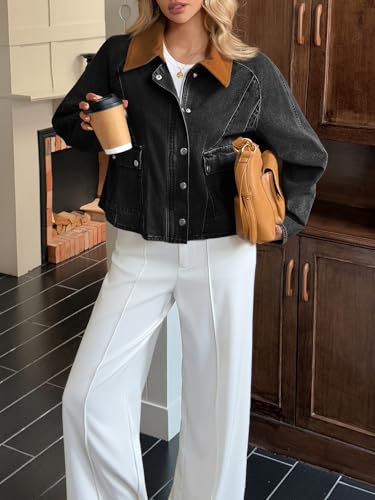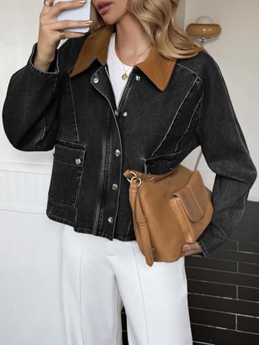 Cicy Bell Womens Cropped Denim Jackets Patchwork Corduroy Collar Barn Jean Jackets Snap Button Coat with Pockets 1
