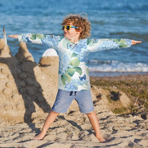 Boys Rash Guard Swim Shirt Long Sleeve UPF+ 50 Sun Shirts Quick Dry Shirt Blue Flower and Butterfly for Toddler Kids 5