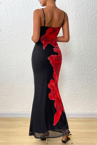 PRETTYGARDEN Womens Summer Dresses 2025 Elegant Spaghetti Straps Evening Gown Floral Print Bodycon Maxi Mesh Sundress