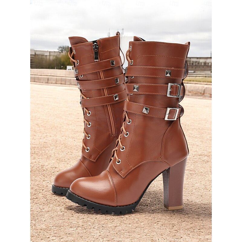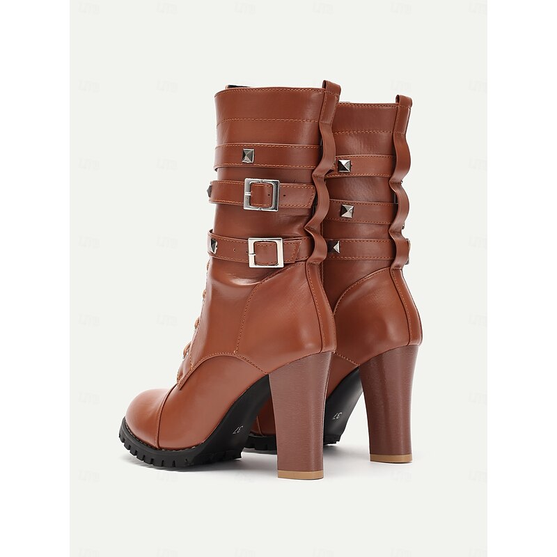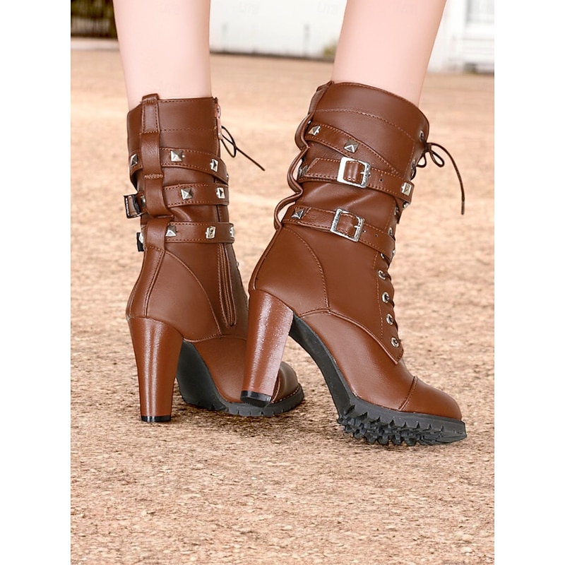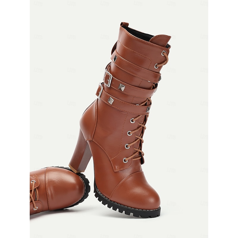 trending ! Women's Brown Lace-Up High Heel Combat Boots – Studded Straps and Block Heel, Rugged Motorcycle Style