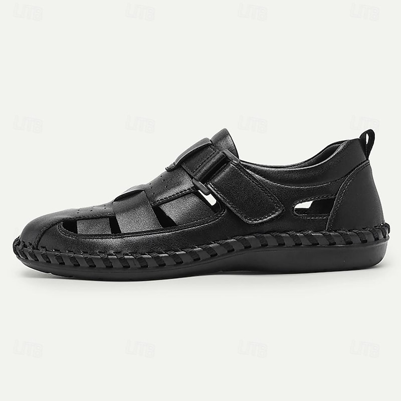 Highlights [Upper Material] : Crafted from premium black leather, these men's sandals feature a breathable upper design with strategically placed perforations to enhance air circulation, ensuring a cool and comfortable wear during warm summer days. [Versatile Style] : The sandals boast a casual yet sophisticated design, perfect for leisurely strolls along the beach or casual outings. The round toe shape combined with a sleek silhouette adds a touch of refined style suitable for both informal and semi-formal occasions. [Design Highlights] : These fishermen sandals are designed with a convenient magic tape buckle closure, allowing for easy adjustments and a secure, personalized fit. The edges are neatly stitched, enhancing both durability and aesthetic appeal. A sturdy rubber outsole ensures slip resistance, providing reliable grip on various surfaces. [Occasions] : Ideal for beach outings, casual gatherings, and day-to-day activities, these sandals offer the perfect blend of comfort and style. Whether relaxing by the seaside or enjoying a city stroll, they are an excellent choice for the modern man seeking functionality and flair. [Size Range] : Available in a comprehensive range of sizes from US6/EU39/UK5 to US13/EU46/UK12, these sandals cater to a wide variety of foot sizes, offering a comfortable fit for every wearer.