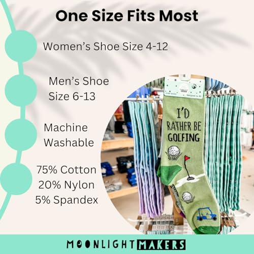 Origin: ImportedNothing says, I'm super fun like a funny pair of socks! Our socks are soft, cozy and guaranteed to brighten your day. Whether you are lounging around the house or going to a serious business meeting, we've got your feet covered. All of our socks are happily designed and printed in the USA.Crazy pleasant: Our socks women and men adore are crafted from 75% cotton, 20% nylon, and 5% spandex. These cotton socks offer a snug fit and lasting comfort with a Y heel counter, making them the ideal companion for your feet.Perfect gift: Our collection of crazy funny socks offers plenty of options for gift giving. Need stocking stuffers for teenage girls and boys, best friend gifts, gifts for mom, gifts for dad, birthday gifts, adult female gift ideas, small funny gifts, gift socks for men, or a treat for yourself? Be sure to check all of our funky styles for the perfect gift for everyone!Unisex One Size Fits Most: Moonlight Makers socks are made to fit Women's shoe size 4 to 12 and Men's shoe size 6 to 13 and will fit most teens and adults. Crafted for comfort with a blend of soft and luxurious cotton, moisture-wicking nylon, and stretchy spandex, these fun socks are the perfect blend of style and comfort, perfect for any occasion.Easy Care: Machine washable and always ready for your next adventure. Wear them to the beach, work, or school, and toss them in the washer to do it all over again. These crew socks for women and men are fashionable and comfortable and sure to make a regular appearance in your fits! Perfect for everyday use. first-class materials and excellent craftsmanship ensure long-lasting durability.