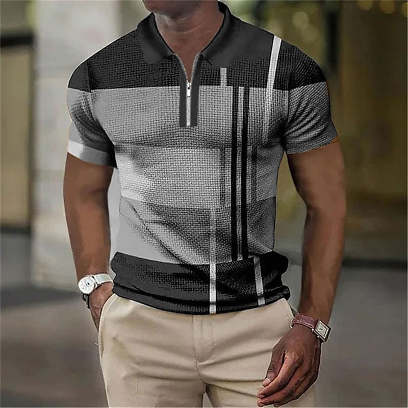Highlights [Fabric] : Crafted from a lightweight and breathable waffle fabric, this men's polo shirt offers comfort and ease in both casual and semi-formal settings. It's designed to keep you cool and comfortable during warmer seasons. [Fit] : The shirt features a regular fit that provides both comfort and style, enhancing the wearer's silhouette with its tailored appearance. [Design Highlights] : This polo shirt showcases a modern geometric print with a sleek mix of black, gold, and grey tones. The sleek zip collar adds a contemporary touch, and the turndown neckline enhances its sophistication. [Occasions] : Perfect for a variety of settings, including street style, daily wear, casual outings, and outdoor activities. Whether you're going for a walk in the park or enjoying a day out, this polo keeps you looking sharp and stylish. [Size Range] : Available in a wide range of sizes from S to 3XL, ensuring a suitable fit for various body types. Perfect for everyday use. supreme materials and excellent craftsmanship ensure long-lasting durability.
