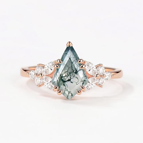 Natural Moss Agate Engagement Rings for Women Promise Ring with 1CT Kite-cut Moss Agate Ring for Women 925 Sterling Silver 10K 14K 18K Gold