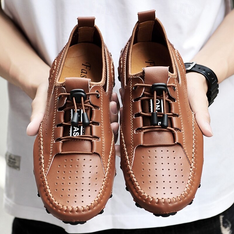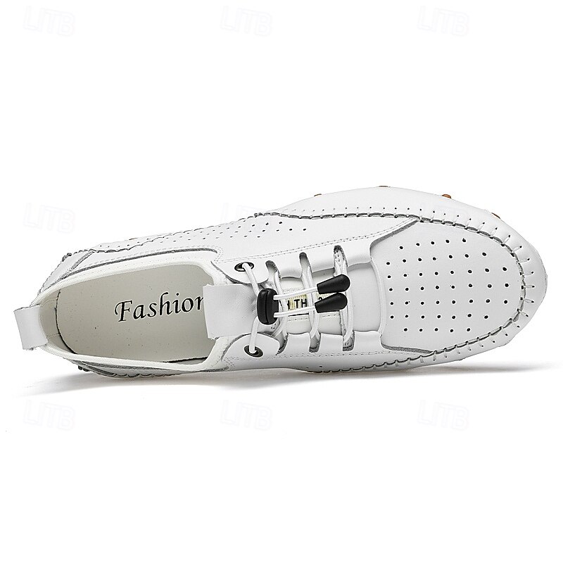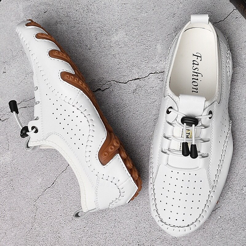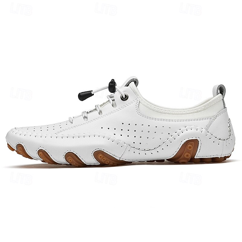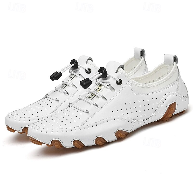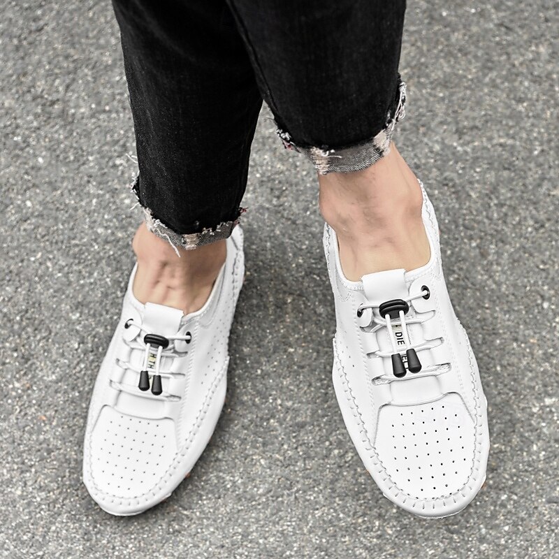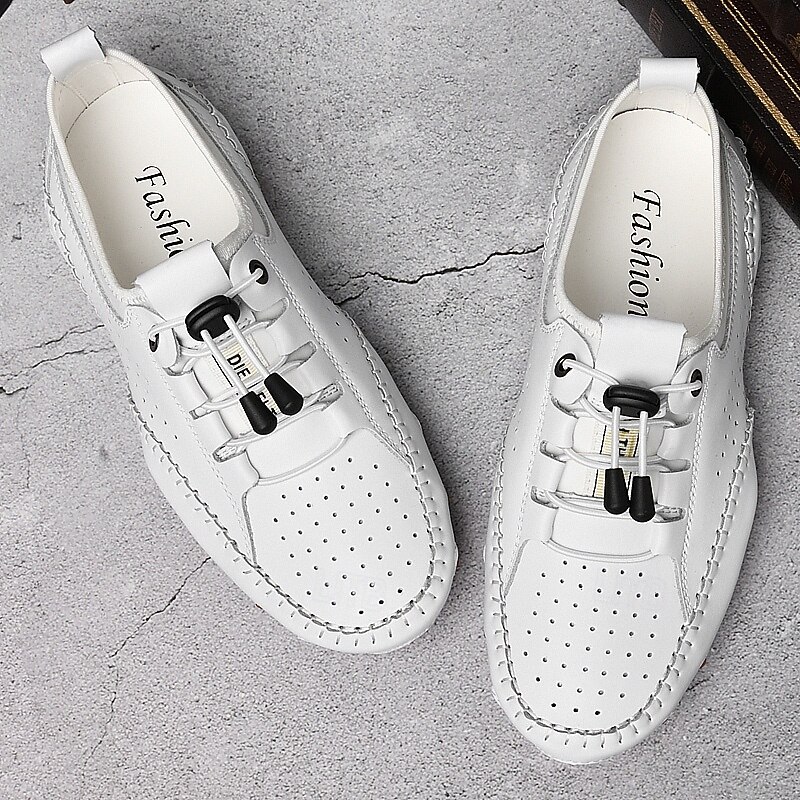 Highlights [Fabric & Material]: Crafted from premium leather with a PU lining, these men's casual shoes feature a breathable mesh upper with sleek perforations. This combination ensures enhanced breathability, keeping your feet comfortable during wear. [Design & Fit]: The shoes boast a sleek and sporty design in a predominantly white color scheme, complemented by hand-stitched detailing. The elastic bungee lace system offers an adjustable and secure fit, enhancing convenience and style. With a round toe shape and a unique segmented tan-colored rubber outsole, these shoes are designed for flexibility and superior traction on various terrains. [Design Highlights]: Featuring hand-stitched detailing and a perforated design, these shoes emphasize both function and fashion. The contrasting colored outsole not only adds visual appeal but also ensures slip resistance, making them a standout choice for any casual wardrobe. [Occasions]: Perfect for casual outings, weekend gatherings, and light athletic activities. Whether you're heading for a relaxed day with friends or a leisurely walk, these shoes provide both comfort and style. [Size Range & Recommendations]: Available in a variety of sizes, ranging from US7 to US11.5, these shoes cater to a broad spectrum of foot sizes, ensuring the right fit for every wearer. Ideal for those seeking a blend of comfort and contemporary style in their everyday footwear. Perfect for everyday use. supreme materials and excellent craftsmanship ensure long-lasting durability.