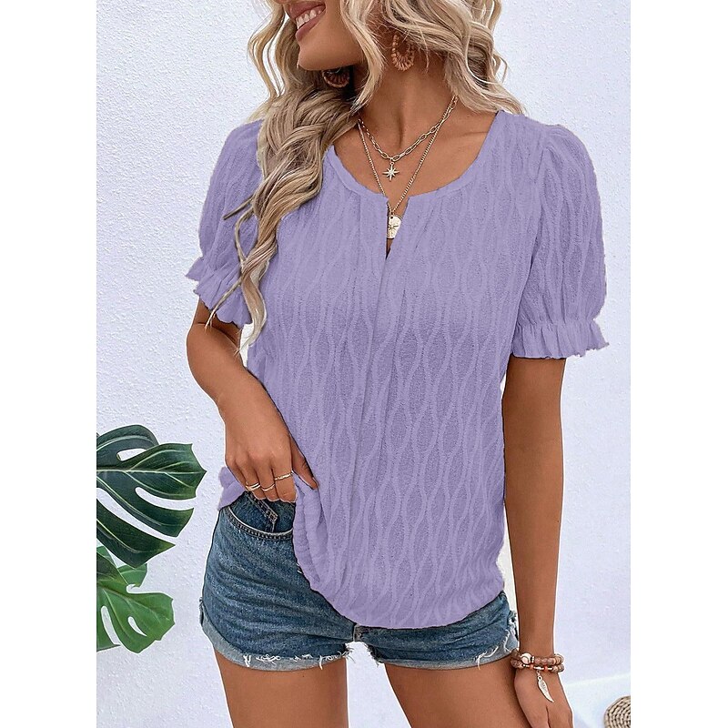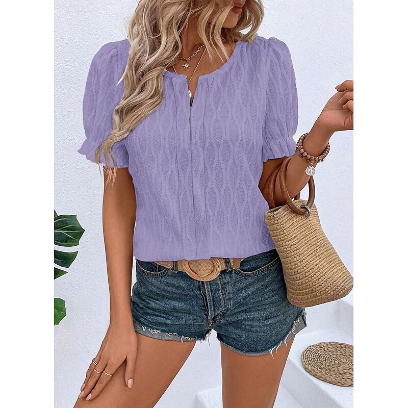 trending ! Women's White Elegant Lace Tops Eyelet Blouse Dressy Tops Plain Regular Tops Short Sleeve Puff Sleeve V Neck Lace Regular Fit Vacation Daily Romantic Petite Tops Summer Holiday Wear Blue Purple Khaki