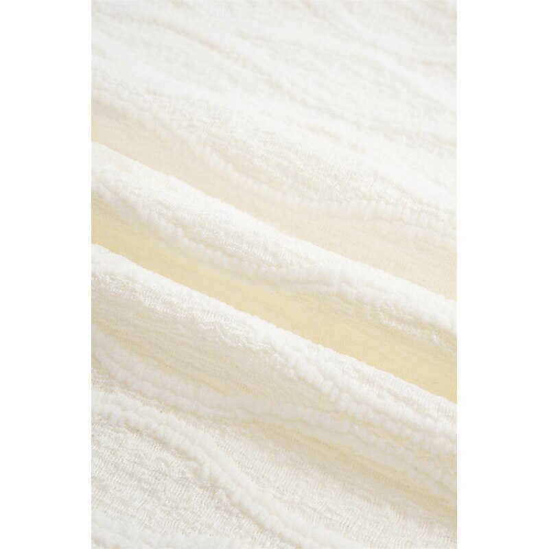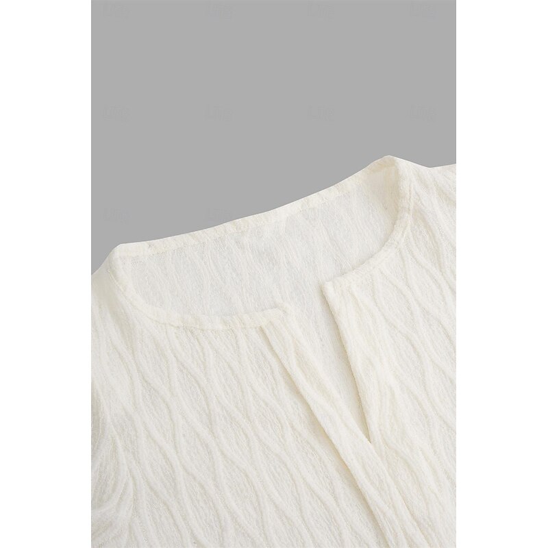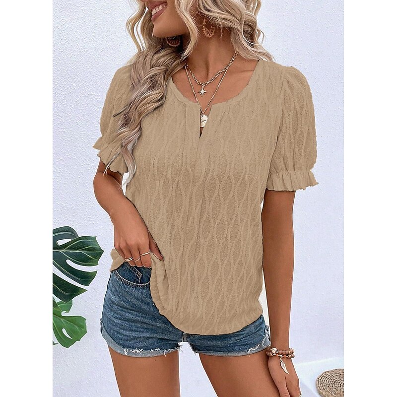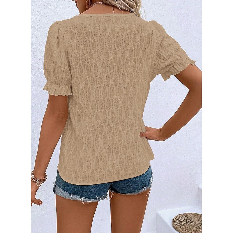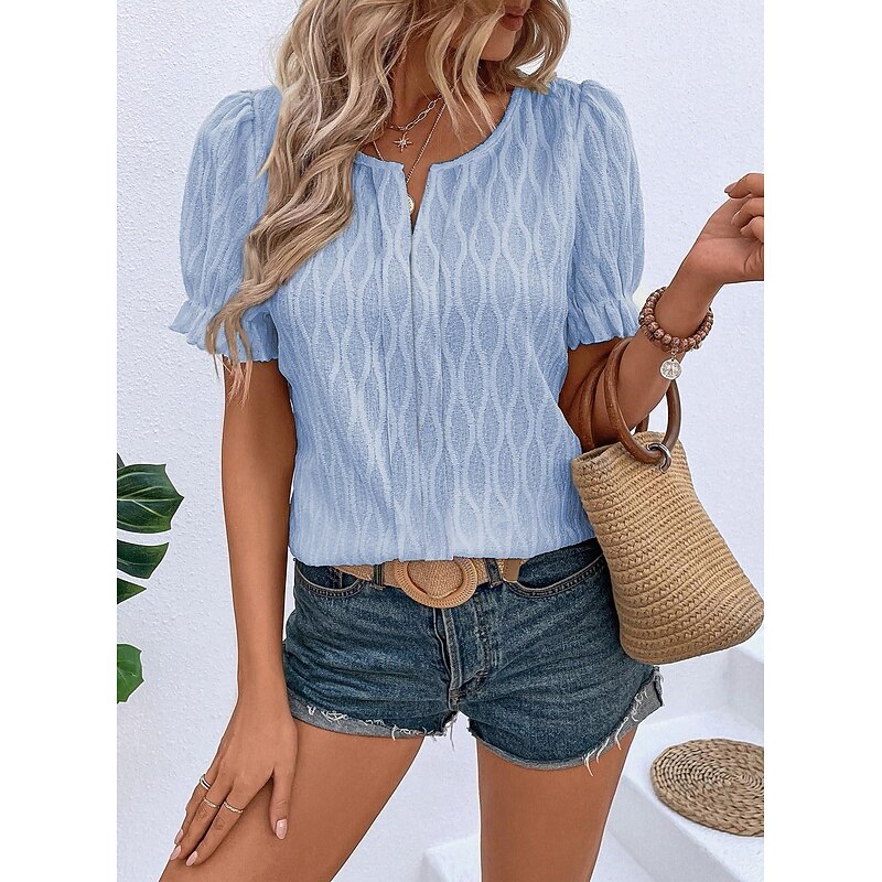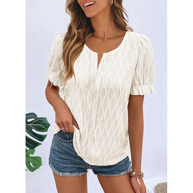 Highlights [Fabric] : Crafted from a premium cotton blend, this women's top offers a soft texture and micro-elastic comfort, ensuring ease of movement while maintaining a chic appearance. The lace details add a layer of sophistication, making it an excellent choice for those who appreciate both style and comfort. [Fit] : This top features a regular fit, providing a relaxed but flattering silhouette that suits a variety of body shapes. The regular length ensures it can be easily paired with different bottoms, enhancing its versatility for everyday wear. [Design Highlights] : The V-neck design is complemented by elegant puff sleeves with delicate ruffle trims, adding a feminine and fashionable touch. The plain pattern and minimalistic lace accents make it suitable for multiple occasions, creating an effortlessly fashionable look. [Occasions] : Perfect for summer vacations, casual outings, and daily wear, this top adds a breezy yet polished touch to any ensemble. Whether you're strolling on the beach or enjoying a casual day out, its light color options make it easy to match with any outfit. [Size Range] : Available in sizes S, M, L, XL, and 2XL, this garment offers a wide size range, ensuring a cushy and flattering fit for various body types.