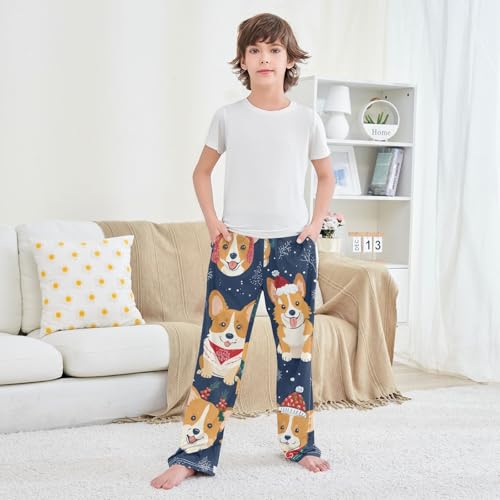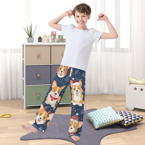 HOT ! Christmas Corgi Dog Snowflake Boys Long Pants Soft Trousers Elastic Waist Kids Lounge Bottoms with Pockets S-XL
