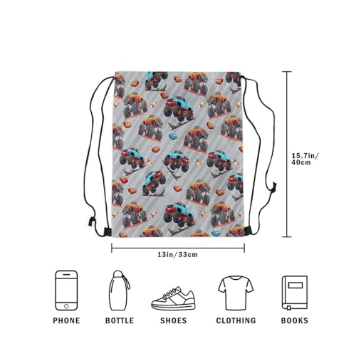 HOT ! Cartoon Trucks Drawstring Backpack Blue Orange Off-Road Vehicle Gym Cinch Sack Sports Draw String Knapsack Grey Tire Print Cute Car Rocket Hippie Bag for Camping Climbing 13"x16"