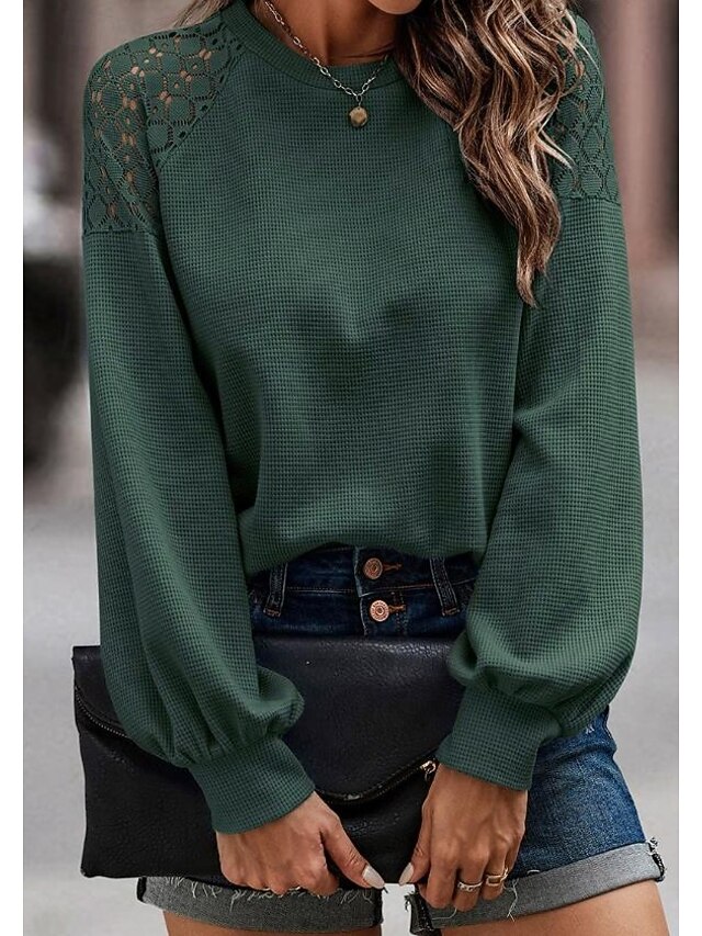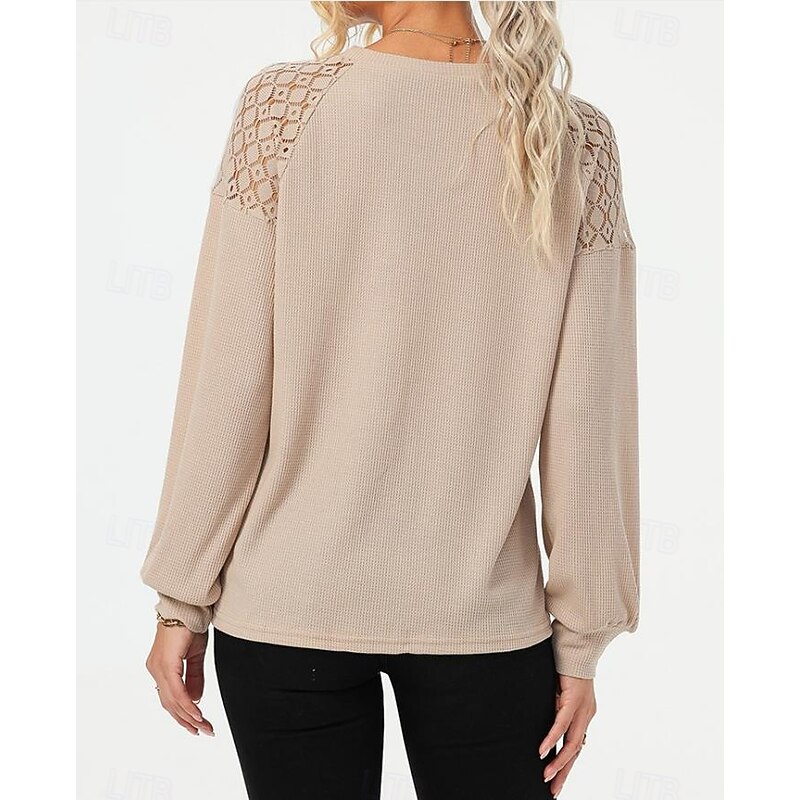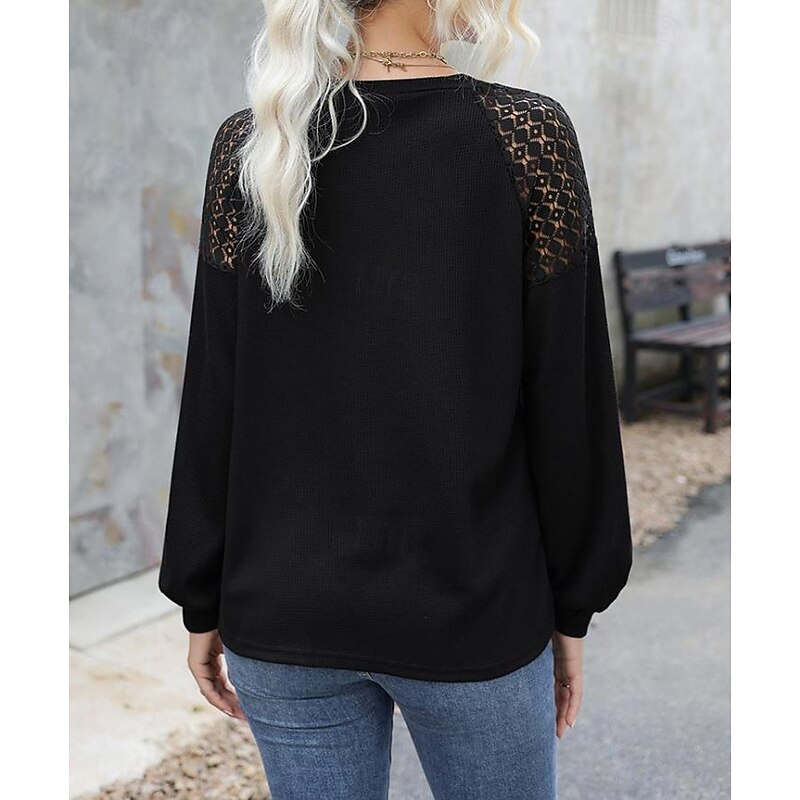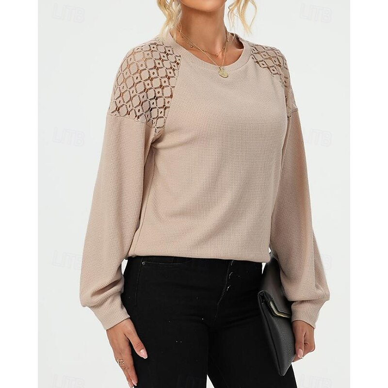 Highlights [Fabric] : Crafted from high-quality polyester, this women's blouse offers a soft, breathable fabric that ensures a comfortable fit for all-day wear. Its micro-elastic properties allow for ease of movement, making it a practical choice for the fall and winter seasons. [Fit] : Featuring a loose fit design, this blouse provides a relaxed silhouette that combines comfort with elegance. The regular top length and long sleeves enhance its versatility, allowing it to be paired effortlessly with various wardrobe pieces. [Design Highlights] : This blouse stands out with its exquisite lace detailing on the shoulders, adding a feminine and sophisticated touch. The crew neckline offers a iconic element, while the slightly puffed long sleeves, cinched at the cuffs, add volume and style to the overall look. [Occasions] : Perfect for daily wear, casual outings, and work environments, this blouse's vintage and elegant style makes it suitable for a diverse range of occasions. Whether dressing up for a day at the office or a casual weekend gathering, it enhances any outfit with its fashion-forward appeal. [Size Range] : Available in sizes S, M, L, and XL, this blouse caters to a broad range of body types, ensuring an ideal fit that enhances the blouseβs flattering silhouette. Perfect for everyday use. superior materials and excellent craftsmanship ensure long-lasting durability.