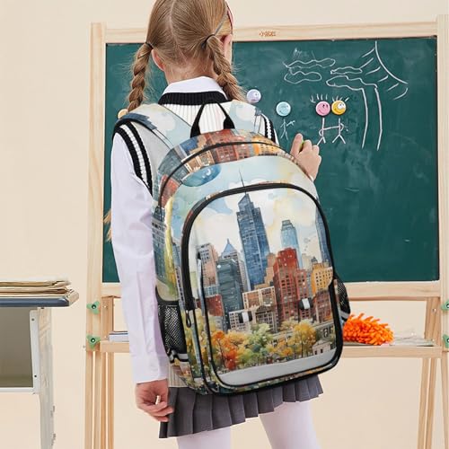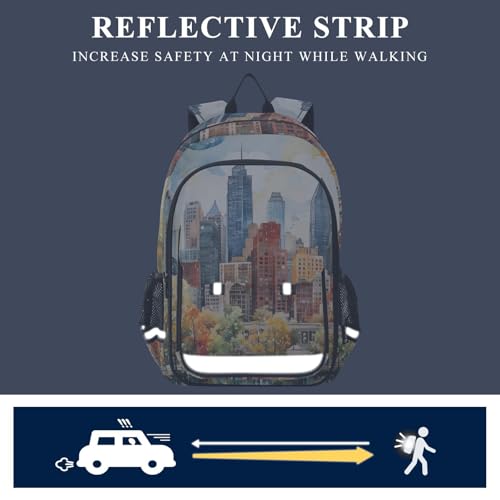 trending ! City Skyline Watercolor Backpack Travel Laptop Daypack Shoulder Bag Book Bag Daypack with Reflective Strip 12.9 ×17.7 In