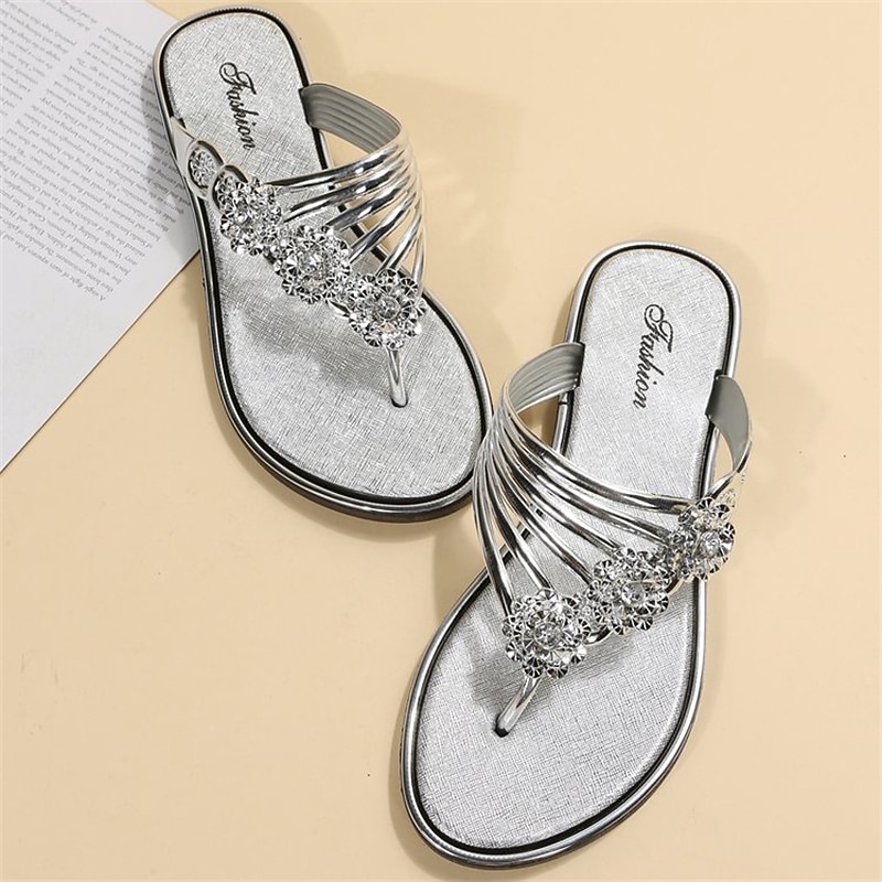 Highlights [Fabric] Crafted with gleaming faux leather, these sandals feature a luxurious gold-toned material and rhinestone embellishments for a sophisticated look. The durable rubber outsole provides stability and traction, suitable for long summer days. [Silhouette] These stylish slip-on sandals offer an open-toe design and flat heel, perfect for a casual yet chic appearance. The footbed is lined with soft textile, ensuring all-day comfort. [Design Highlights] The main strap sparkles with three carefully placed rhinestones that add a glamorous touch. The gold slip-on style catches the light beautifully, making these sandals a standout choice for any occasion. [Occasions] Ideal for outdoor events and beach outings, these sandals seamlessly transition from day to night. Whether you're attending a relaxed beach gathering or enjoying a casual evening out, they complement dresses, skirts, and jeans effortlessly. [Size Notice] Available in a range of sizes from US6 to US9, these sandals offer versatility and a comfortable fit for a variety of foot shapes. Perfect for those who desire both style and comfort in their summer footwear.
