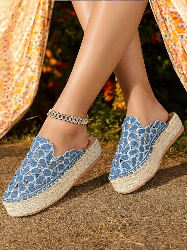 HOT ! Women's Blue Lace Espadrille Mules – Floral Cutout Slip-On Platform Shoes for Summer, Casual Outings, and Beachwear