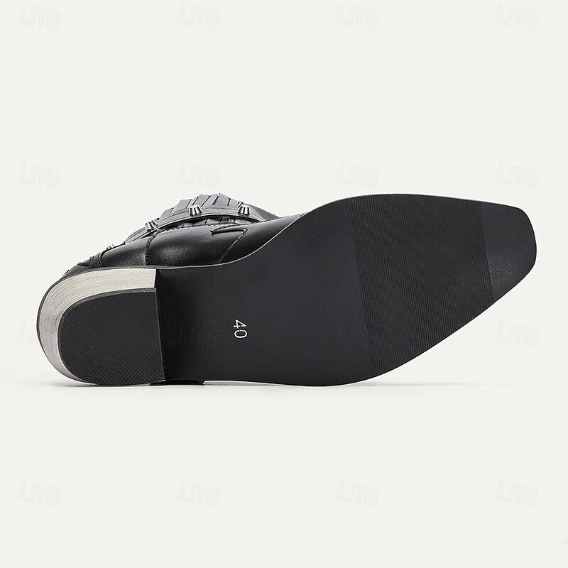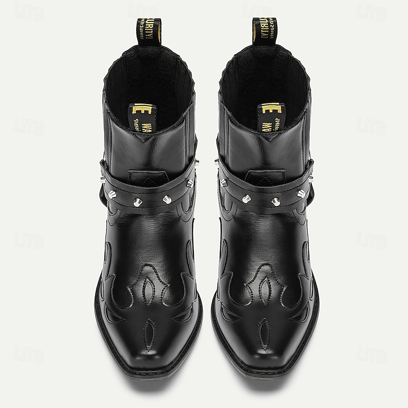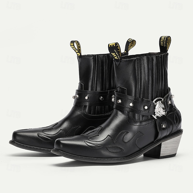 Highlights [Fabric and Materials] These men's ankle boots are crafted from premium PU leather, giving them a sleek, robust finish that is both durable and chic. The solid-colored design adds to their versatility, making them a perfect choice for various outfits. [Style and Fit] Featuring a punk-inspired, casual look, these boots stand out with their round toe shape and low, chunky heel that promises comfort without compromising on style. The boot shaft height classifies them as ankle boots, perfect for a relaxed fit while providing essential support. [Design Highlights] The boots are adorned with a striking flame embroidery that delivers a bold, edgy vibe, and a decorative strap with metallic studs. This design element is complemented by a silver-tone metal buckle, enhancing the boots' modern flair. Pull tabs are added for easy slip-on convenience, combining style with functionality. [Occasions] Ideal for everyday wear, these boots seamlessly blend Western and biker aesthetics, making them a suitable choice for casual outings or a fashionable statement at biker gatherings. Their punk and retro appeal ensures they fit well into a variety of settings. [Size and Fit Suggestions] Available in a wide range of sizes from US6 to US12, these boots are designed to be true to size, allowing you to select your usual shoe size for the perfect fit. Perfectly suited for seasons like spring and fall, they cater to both men's and women's fashion sensibilities. Perfect for everyday use. first-class materials and excellent craftsmanship ensure long-lasting durability.