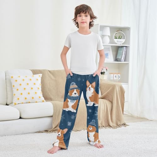 HOT ! Corgi Dog Snowflakes Boys Long Pants Soft Trousers Elastic Waist Kids Lounge Bottoms with Pockets S-XL