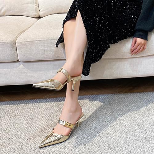 Sole material: RubberOuter material: LeatherClosure type: Pull-OnWater resistance level: Water ResistantElegant closed pointed toe: This women's high-heeled sandal adopts an exquisite closed pointed toe shape, which cleverly elongates the leg line, showing the feminine and elegant temperament. It can be easily worn in both formal occasions and fashionable parties.Convenient slip-on style: The unique slip-on design does not require complicated lacing, and can be easily put on with one slip, which not only saves time but also adds a bit of casualness and freedom. It is an ideal choice for busy urban women.Fashion single-strap slingback design: The upper adopts a simple but fashionable single-strap slingback design, which not only stabilizes the foot but also shows a light and agile beauty, adding a highlight to the overall shape, suitable for various formal and semi-formal occasions.Stable stiletto heel: The 2.56-inch heel not only increases the height and makes the steps more graceful, but also ensures stability and comfort when walking, making you confident at parties or weddings.Wedding Party Pumps: This high-heeled sandal is a classic gold yet chic design that is perfect for weddings, formal dinners, business gatherings and other occasions. It is an indispensable fashion item in every woman's shoe cabinet. Perfect for everyday use. first-class materials and excellent craftsmanship ensure long-lasting durability.