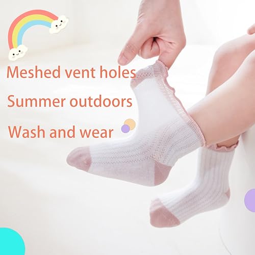 Fabric type: 90% cotton/11% rayonCare instructions: Machine WashOrigin: ImportedPattern: SolidMade of high-quality combed cotton with a mesh ventilation design, it absorbs sweat and moisture without feeling stuffy, soft and skin-friendly without rubbing the, keeping your baby's little feet dry and snug in the summer, saying goodbye to stickiness.Wide-ribbed cuff design, snug around the ankle without slipping down, and avoiding marks, allowing the baby to run and jump freely, and the does not need to adjust frequently, making it more worry-free for taking care of the child.Durable and washable, not easy to deform, high-density weave reinforced seams, still soft and new after multiple machine washes, no pilling, shrinkage, worry-free and long-lasting.Baby lace socks, breathable and lightweight, perfect for many flower girl, beauty pageant and other special occasion dresses, get your baby in love with socksScientific age grading scale (adjustable according to actual conditions), close to the child's foot shape, suitable for both boys and girls, and can be at will. Perfect for everyday use. supreme materials and excellent craftsmanship ensure long-lasting durability.
