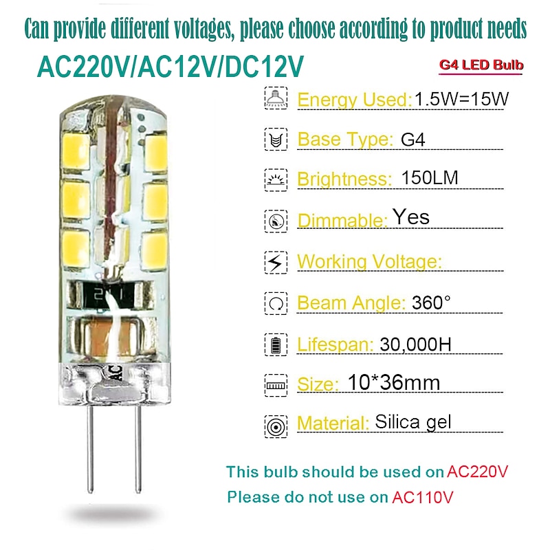 $13.99 - 10pcs G4 Bi-pin LED Light Bulb 3W 24LED SMD 2835 Equivalent Halogen Bulb 30W Warm white 3000K Daylight White 6000K 360° Beam Angle Flicker Free DC12V AC220V AC110V 2025. Shop for cheap LED Bi-pin Lights online? Buy at lightinthebox.com on sale today!