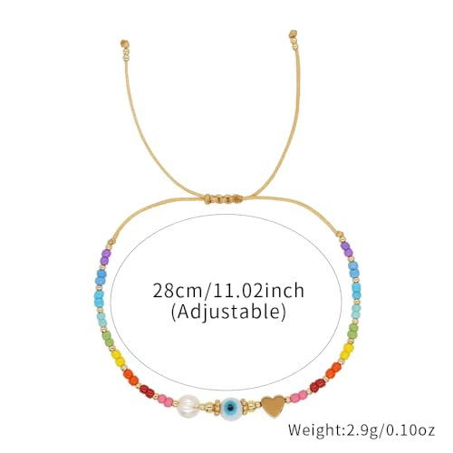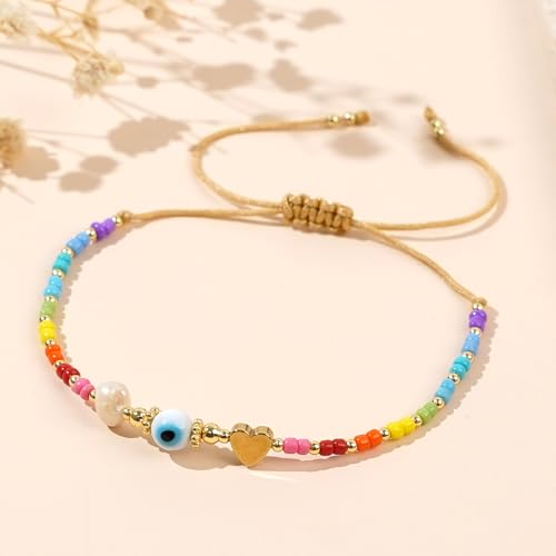 Evil Eye Beaded Bracelet for Women - Handmade Boho Stackable Colorful Gold Seed Beads Stack Pearl Heart Charms Adjustable Protection Bracelet Evil Eye Jewelry Summer Beach Friendship Gift
