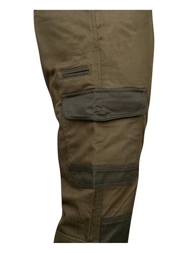 Heavyweight polycotton Button waist with comfort expanders Two front pockets Two rear pockets with button closure Two leg pockets with press stud flaps Knife pocket Ankle zips Contrast Green
