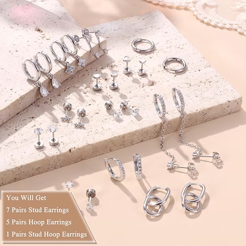 Material: Stainless SteelMetal type: Stainless SteelBack Finding: Screw BackGem type: Cubic ZirconiaItem type name: Stud Earrings【Trendy Stud & Hoop Earrings Set for Stacks】13 pairs silver earrings set with 300+ lab-tested combos, 6 pairs of flat back earrings, 3 pairs of dangle earrings, 2 pairs of small huggie hoop earrings, 1 pair of earrings jacket, 1 pair of chain stud earrings = 300+ Looks. From office-chic minimalism to layered party glam, effortlessly style every earring piercing from first ear lobes to cartilage【Implant-Grade Surgical Steel Earrings】Comfy silver flat back earrings for women, crafted with 316L surgical stainless steel, tested by over 100+ women with metal sensitivities. The Poke-Free flat back earrings design reduces pressure by 90% compared to standard earrings buckles, practices proven for 96-hours continuous wear. These cartilage earrings for women are ideal for new piercings beginer and sensitive ears【20G Flat Back Earring Size】These hypoallergenic earrings for women feature 0.8mm(20g) posts with internally threaded screw backs for a secure fit, the 5mm smooth flat backs prevent hair snagging and ensure all-day comfort(IF YOU CAN'T SCREW OFF THE BACK, PLS USE THE SILVER CLOTH AS TOOL TO REMOVE IT), especially Poke-Free!!! Silver earrings stay in place during sleep, exercise, providing seamless comfort【Cartilage Earring Sets for Multiple Piercing】silver earring sets for multiple piercing, highlight your ear game with these stunning stud hoop earrings for every piercings: ear jackets for lobes, flat back stud earrings for tragus or daith, small huggie hoops for conch or helix, lightweight dangle hoops for ear lobes. Each piece is weight-balanced for comfort, ideal for mutiple piercings【Gift Box Included】Silver earrings come with a dainty gift box. These cartilage earrings for women are perfect daily jewelry for any occasion, casual to formal, sleek design helps make you stand out in the crowd, a perfect hypoallergenic flat back earrings gifts for women, sister, friend or lover on birthday, thanksgiving’s day, anniversaries, valentine’s day, etc, express your love to them【Why Choose Us】Enjoy confidence in your purchase with our quality customer service : 365 days after sales service for these silver earrings for women. Contact us if you have any problems about our surgical steel earrings, we will try best to make you satisfaction Perfect for everyday use. supreme materials and excellent craftsmanship ensure long-lasting durability.