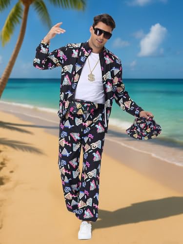 Fabric type: PolyesterCare instructions: Machine WashOrigin: ImportedComplete Retro Set: The 9Pcs 80s outfit includes: 1 * Jacket+1 * Pant+1 * Hat+1 * Sunglass+1 * dollar pendant Ring+1 * dollar pendant Necklace+1 * Bag+1 * Balloon Radio+1 * Bracelet. Funny and cool rapper costume set perfect for your 80s/ 90s dress up, so that you can stand out in the crowd and release the brilliance.High-Quality Materials: Mens 80s Outfit is made of polyester fabric, very lightweight, breathable, soft, and skin-friendly, with no balling and no fading. Sportswear is designed with a fashion and casual theme, the jacket and sweat pants have an elastic waistband, ensuring a comfortable fit, let you party or jogging comfortably.Unique Upgrade Design: The 80s 90s Outfit for men features a advanced digital printing technology, with clear and funny printing patterns, a variety of colors and graphics splicing combinations, more interesting. The retro jacket with a practical zipper and pocket, high waist long pants with adjustable drawstring. Cdnvenient to wear and with a chic look.Versatile Style: 80s outfit for men perfect for disco parties, beach outings, themed events, or just adding some retro flair to your everyday wardrobe.They were the preferred choices for music parties, vacations, and outdoor activities in the 80s and 90s.Fun Accessories: Complete your look with the included retro hat, stylish glasses, cool necklace, funky bracelet, and a playful inflatable mobile phone for that ultimate throwback vibe. Perfect for everyday use. first-class materials and excellent craftsmanship ensure long-lasting durability.