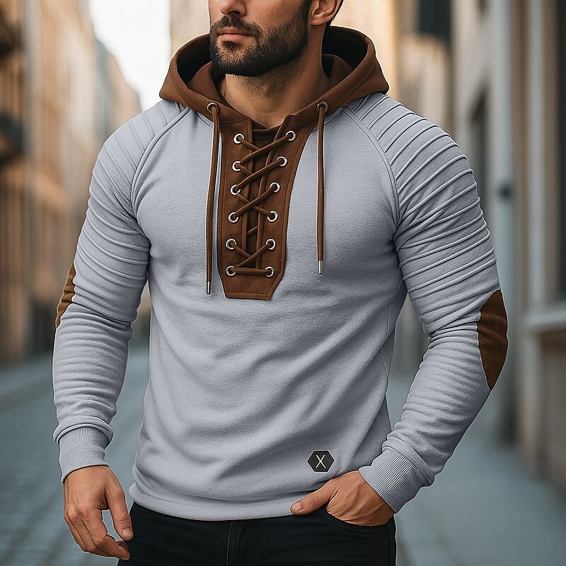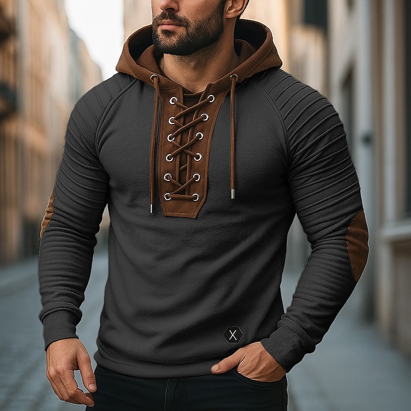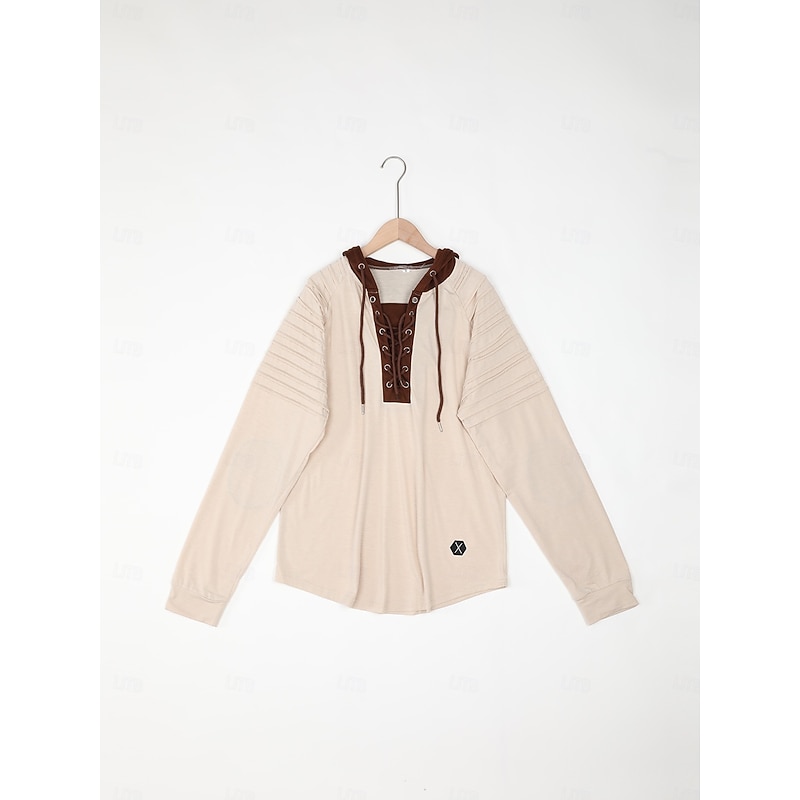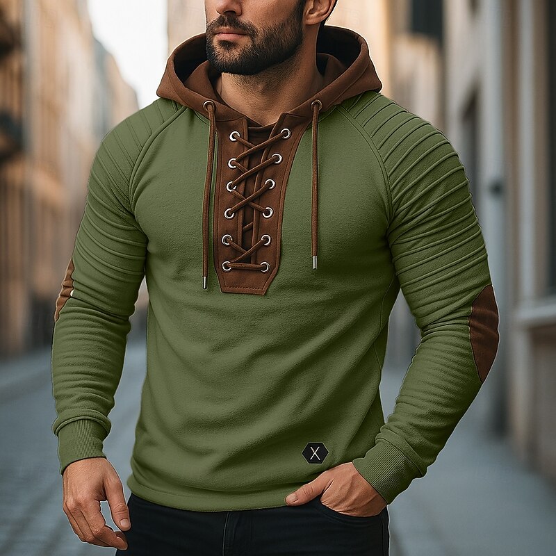 More information about Men's T Shirt Tee Top Long Sleeve Shirt Long Sleeve Hooded Fall Spring & Fall Color Block Slim Pleated Fashion Designer Basic Lace up Patchwork Vacation Street Casual Black Army Green Beige Top Tee