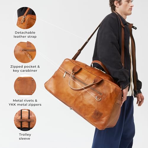 READY FOR YOUR NEXT ADVENTURE? The stylish Austin XL weekender is the perfect companion for your travel, gym, or weekend getaways. This versatile travel bag includes a dedicated shoe compartment, a detachable shoulder strap with a shoulder pad, an external zippered pocket with an integrated key leash, a trolley sleeve, and 6 metal feet for added sturdiness. Airline-friendly, practical, and stylish. Dimensions: 24 x 11 x 11; capacity: 11.8 gal; weight: 4.4 lbs.DESIGNED IN BERLIN, GERMANY. This durable Austin XL carry on bag is thoughtfully designed in Europe and crafted from high-quality, durable materials, offering both long-lasting wear and functionality. The cotton-lined, YKK-zippered main compartment features a dedicated laptop compartment for devices up to 13, a phone pocket, and a key ring. Additional card holders, pen loops, and a YKK-zippered interior pocket keep your essentials neatly organized.MADE TO LAST. We in Berliner Bags believe in quality over quantity. By focusing on fewer, durable, better-made pieces, we extend the life of our bags and reduce waste. Every bag is a lasting investment that brings years of enjoyment.VEGETABLE-TANNED LEATHER. Handcrafted from genuine vegetable-tanned leather, this bag is tanned using natural, chemical-free processes, giving it a one-of-a-kind vintage finish. Certified by TΓV to meet top European standards.SATISFACTION GUARANTEED. Your satisfaction is our number one priority! Every Berliner Bags product comes with a 1-year warranty and a 100-day return policy. (*More details at berliner-bags.com/1year/).GIFT. As a special gift weβve included a genuine leather luggage tag, so you can personalize your bag and keep your belongings safe. Perfect for everyday use. High quality materials and excellent craftsmanship ensure long-lasting durability.