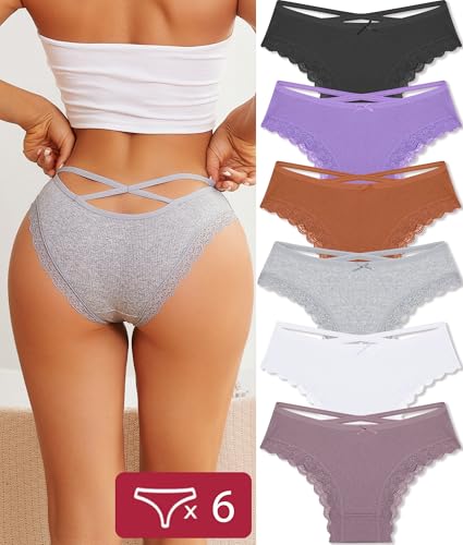 trending ! 6 Pack Cotton Underwear for Women Sexy Lace Bikini Panties Low Rise Hipster Stretch Briefs