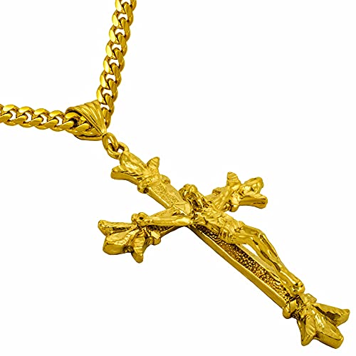 Item display length: 20 inchesItem width: 7 inchesMaterial: MetalMetal type: Yellow-gold-plated-baseClasp type: LobsterChain type: LinkThese Gorgeous Extra Large Saint Thomas Crucifix Pendants are Made To Last with up to 20X more 24 karat gold plating than standard electroplated fashion jewelry; Comes with complimentary 20 inch long 7mm Cuban link necklace chain; Made In USA since 1987 by a small family run businessSt. Thomas Cross Crucifix is 101mm (~4 inch) (bail included); Comes in a black velvet pouch for easy gift giving; This cross is a design from one of the first ancient Christian communities, a great faith present for dad mom grandma grandpa son daughter or a loved one‘’Lifetime Jewelry is the Next best thing to solid gold’’ You can get ten of ours for every piece of 14k or 18k you buyCrosses Are Forever; Inspire others, inspire yourself; Wear these stunning charms with confidence, as not even your jeweler will know this is not solid goldFree Lifetime Replacement Guarantee; Lifetime Jewelry is not just jewelry - it’s our commitment to you for a lifetime; Be it 30 days, a year or a decade - you’ll get a new cross from us if ever any of our pendants break, fade, or simply don’t live up to your highest expectations; Just remember to register your purchase(s) impeccable for everyday use. first-class materials and excellent craftsmanship ensure long-lasting durability.