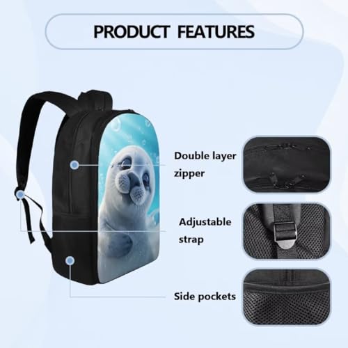 White Seal Print Kids Backpack for Girls 8-12Fashion Girl Print Backpack Multi-pockets Portable Rucksack 17 Inch Waterproof Daypack for Middle Students
