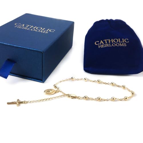 trending ! Stunning Catholic Rosary Bracelet for Women with Our Lady of Graces Medal and Cross Crucifix Charm, 14K Gold Plated, Adjustable - Dainty Elegant Religious Jewelry Gift