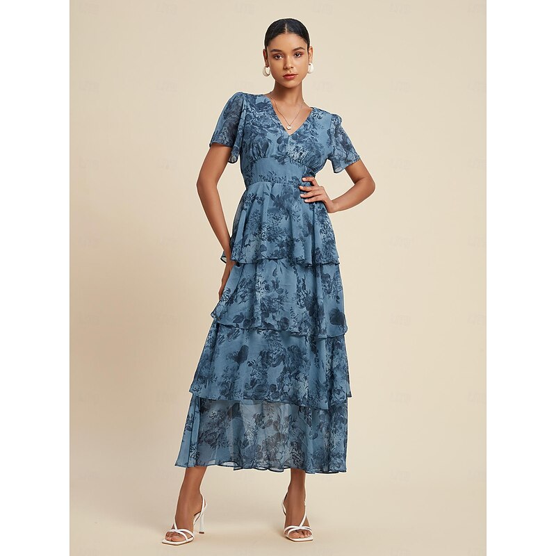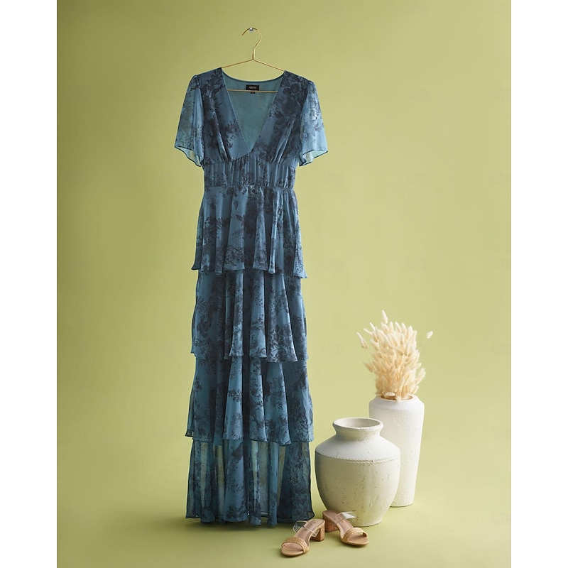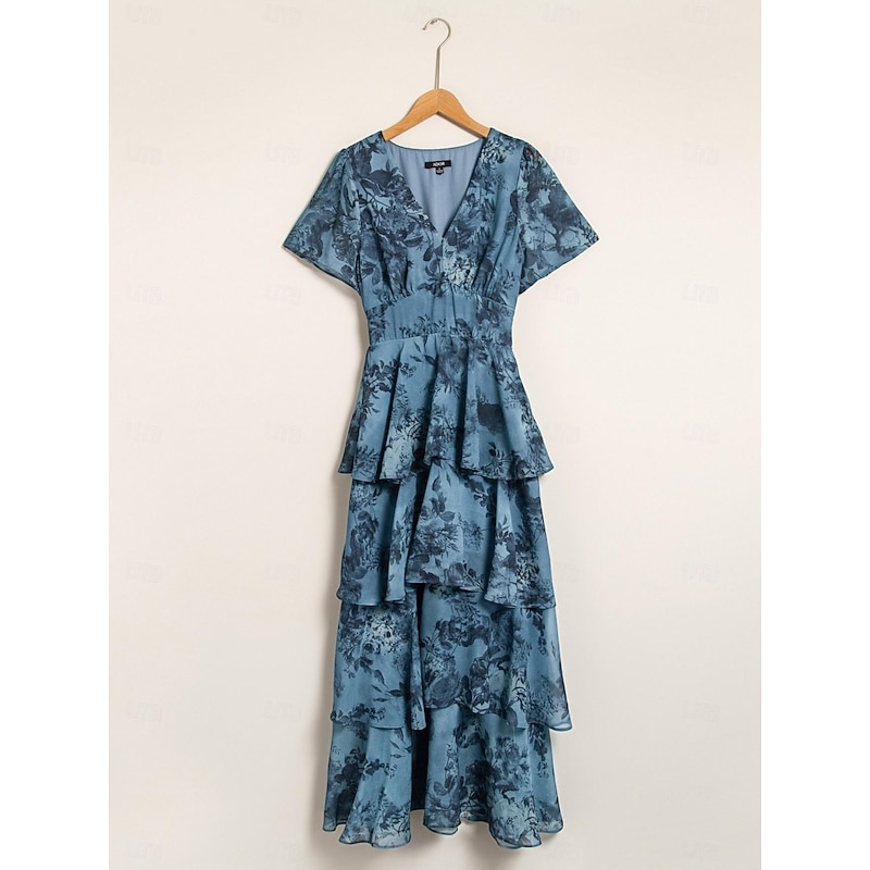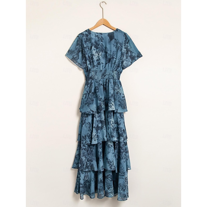 trending ! Women's Wedding Guest Party Navy Floral Chiffon Maxi Dress V Neck Vintage Elegant A Line Tiered Ruffle Cake Skirt Elastic Waist and Back Dress