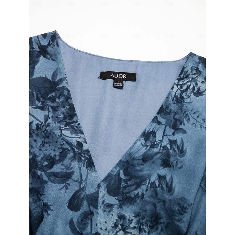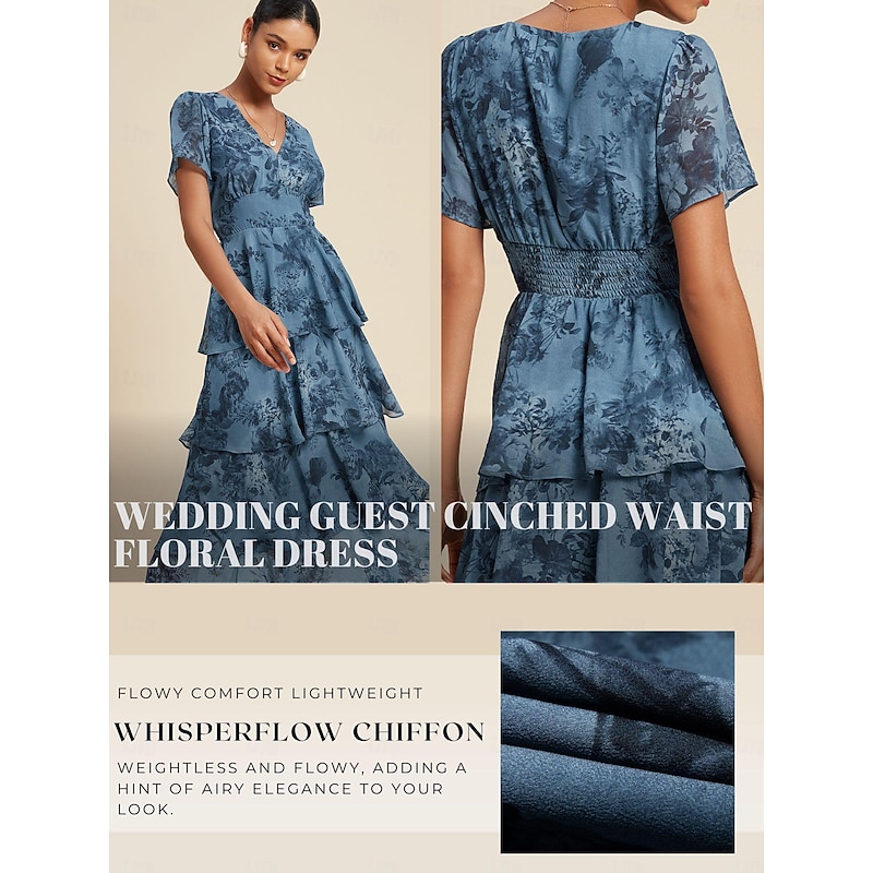 More information about Women's Wedding Guest Party Navy Floral Chiffon Maxi Dress V Neck Vintage Elegant A Line Tiered Ruffle Cake Skirt Elastic Waist and Back Dress