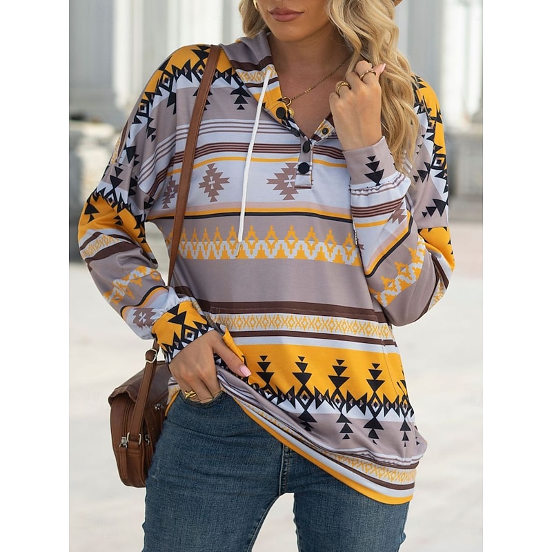 Highlights [Fabric] : Crafted from a high-quality polyester, this women's hoodie sweatshirt provides a soft and cozy feel, keeping you comfortable and warm during the fall and winter seasons. The robust fabric ensures durability, making it an ideal choice for everyday wear. [Fit] : Designed with a regular fit, this hoodie offers ample room for movement and easy layering. The long sleeves and crew neckline enhance the relaxed silhouette, allowing for a comfortable yet sleek look. [Design Highlights] : Featuring a vibrant geometric tribal pattern, this hoodie combines bold teal, rust, and white hues for an eye-catching appearance. The adjustable drawstring hood and buttoned neckline add versatility, while the front kangaroo pocket provides practicality for carrying small essentials or keeping hands warm. [Occasions] : Perfect for dailywear, this casual hoodie is ideal for various relaxed settings, whether running errands, meeting friends, or lounging at home. Pair it with jeans or leggings to achieve a laid-back, fashionable look suitable for any casual outing. [Size Range] : Available in sizes S, M, L, XL, and 2XL, this hoodie caters to a wide range of body types, ensuring a comfortable and personalized fit for everyone. Perfect for everyday use. supreme materials and excellent craftsmanship ensure long-lasting durability.